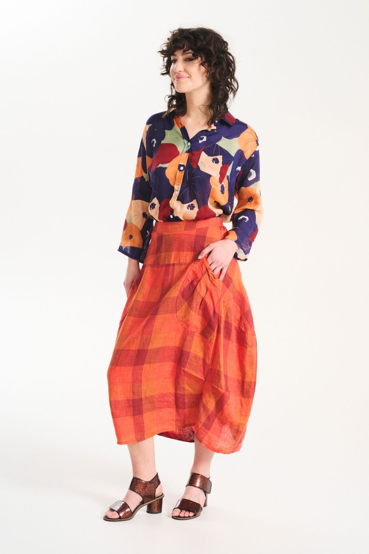 Crafted in a bold orange Amstel check, the Milwaukee Skirt delivers volume, shape, and practicality in one easy piece. The distinctive silhouette and sculptural drape are created by gathered side seams, while the wide waistband ensures a comfortable fit. It’s statement-making yet super wearable.