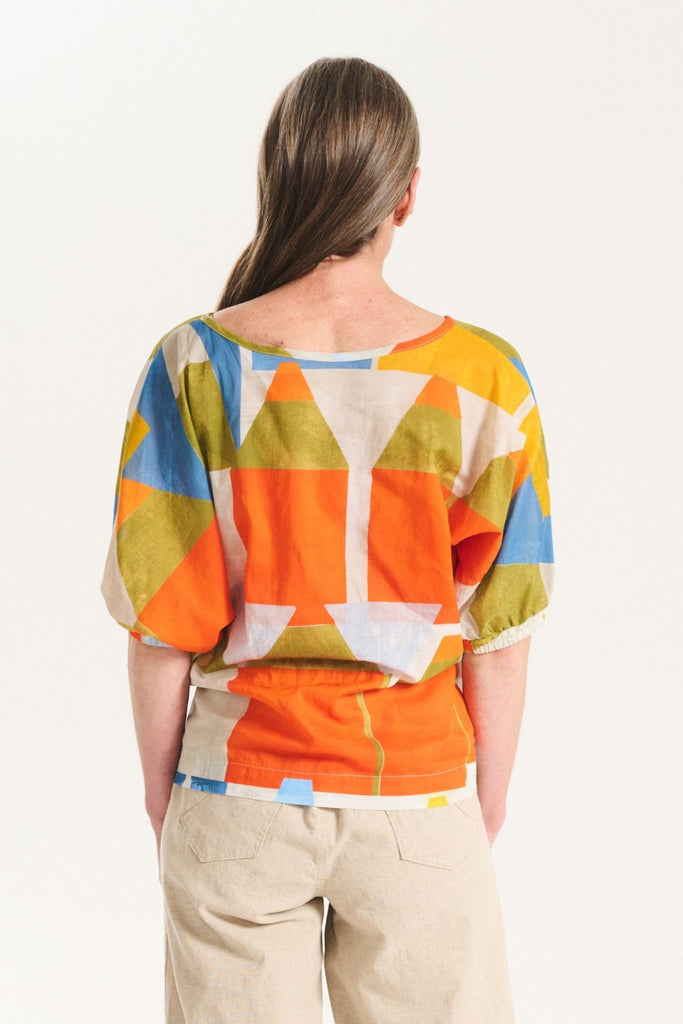 The Camisa Blouse is a reversible top with batwing shaped sleeves and tapers in at the hips. It is oversized at the shoulders and bust, and sits close to the body at the hips, while not being tight.
