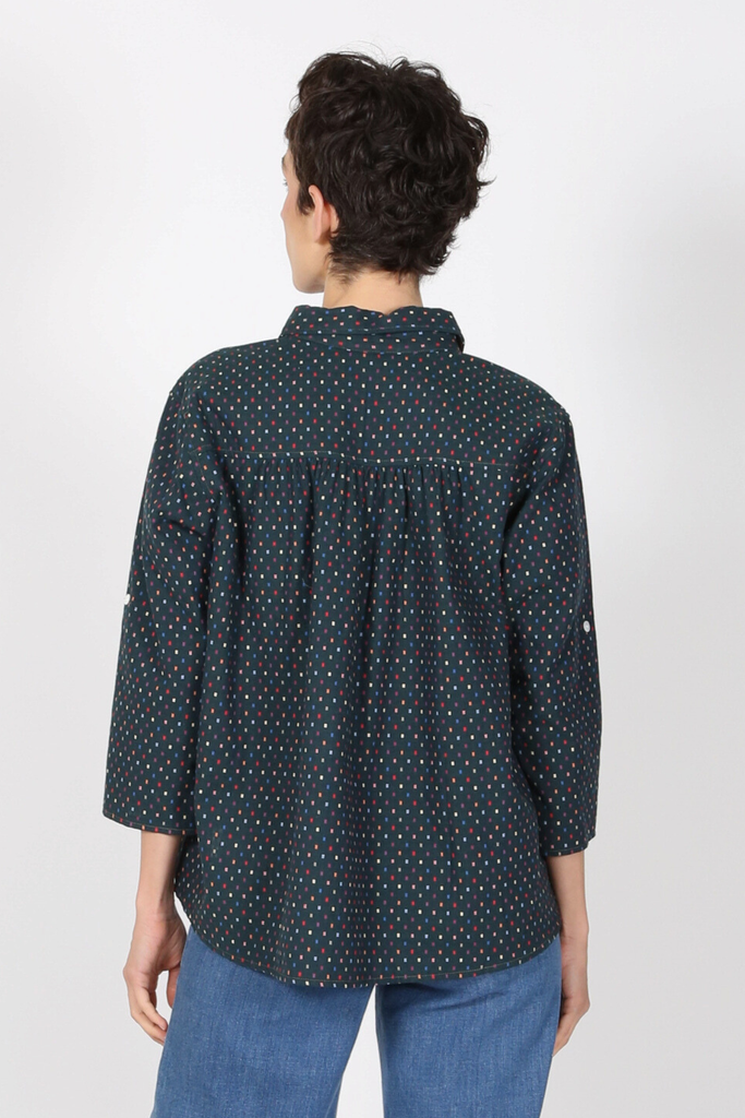Bold but grounded, the Peak Hour Shirt blends artisanal charm with contemporary cool. Crafted in a rich forest green base, this textured cotton shirt is woven through with playful pops of colour — tiny squares in red, mustard, blue and lilac scattered like confetti across a midnight sky. The boxy fit and crisp collar give it polish, while the soft handfeel keeps things casual. Wear it buttoned up for structure or open over a tee for an easy layered look.