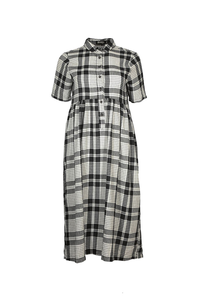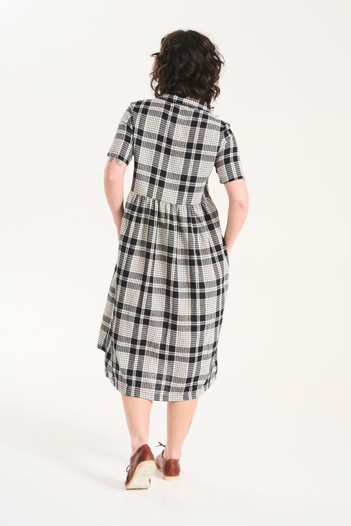 The Bask Dress is a relaxed shirt dress in crisp, lightweight cotton check. Featuring a classic collar, partial button placket, short sleeves, and a softly gathered waist, it creates a flattering mid-calf silhouette. Finished with side seam pockets, it’s perfect for effortless summer layering or warm-weather wear.
