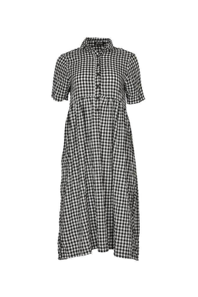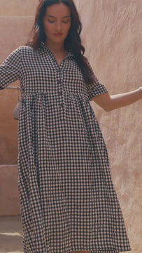 The Sunseeker Dress is a relaxed, everyday shirt dress in lightweight crinkle cotton gingham. With a neat collar, partial button placket, short sleeves, and a softly gathered waist, it offers a flattering mid-calf silhouette. Finished with side seam pockets, it’s an easy, breezy throw-on piece for warm, sunny days.