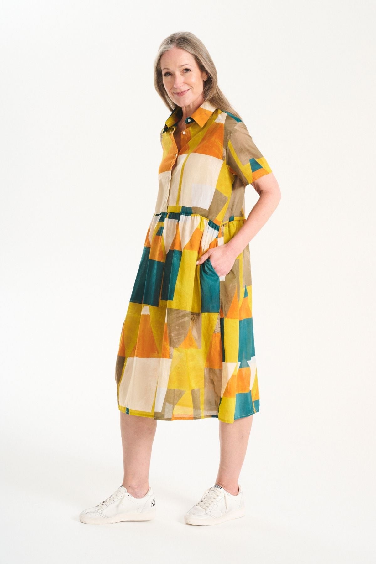 The Villa Dress Long in Kasbah Tales is a great everyday shirt dress, that is extremely light and comfortable. This new version of the Villa Dress has a longer length skirt.