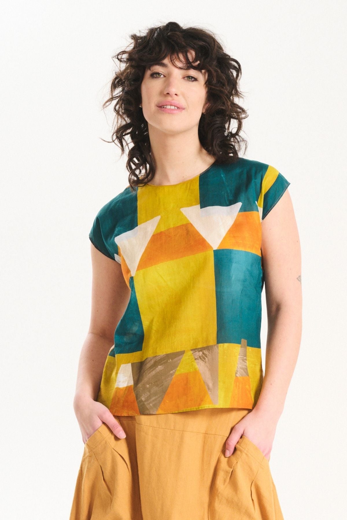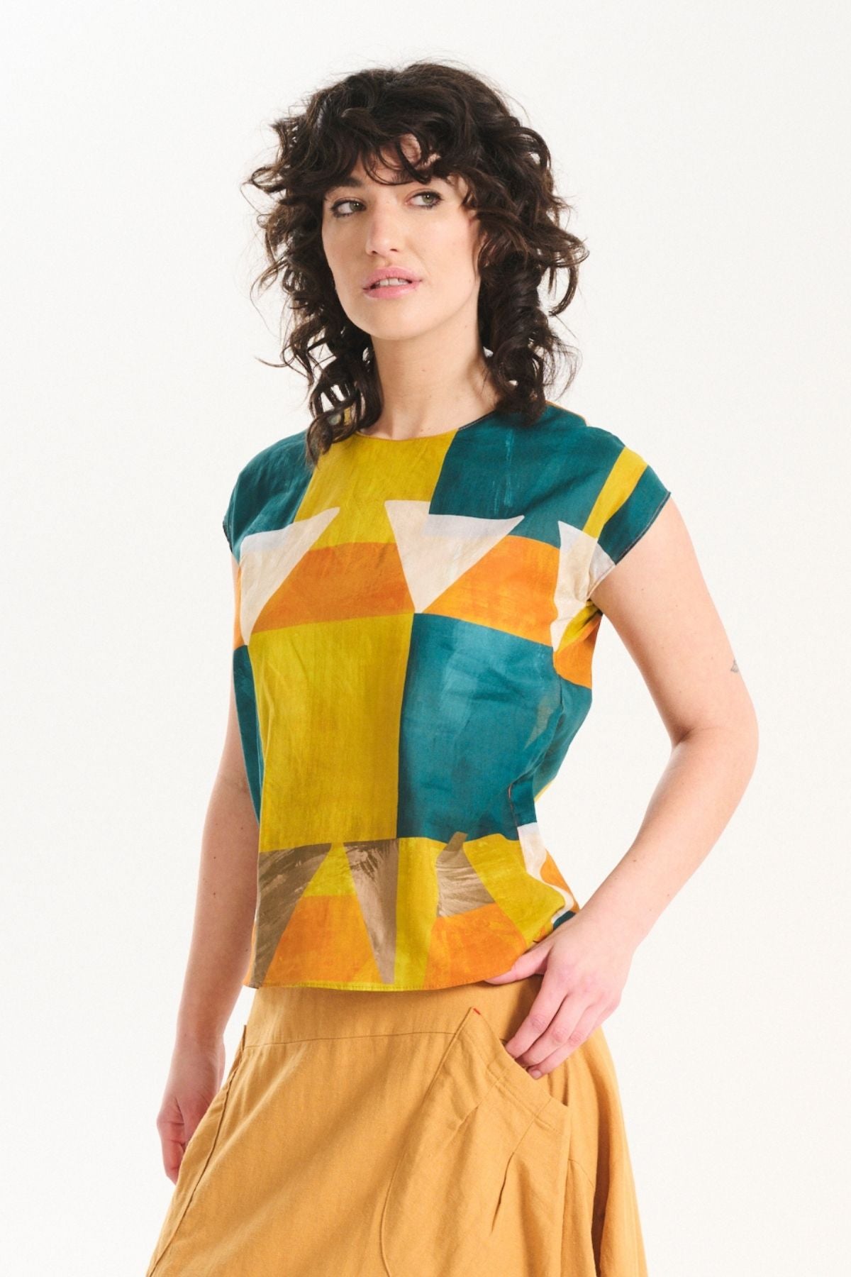 The signature Olga Tee is a slim fit. It is true to size at the shoulders and bust, and sits close to the body while not being tight. It is shaped to taper slightly at the waist.