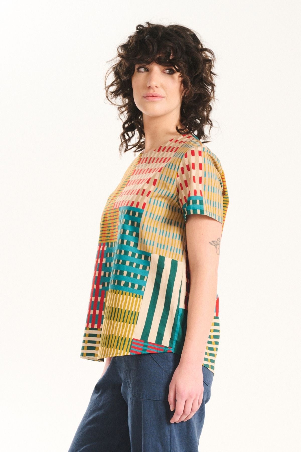 Our signature Olga Top is one of our best-sellers. A little more modest and roomy than the tee, it is a straight cut, with a short sleeve, crew neck and a box pleat at the back to give it more fullness and movement.