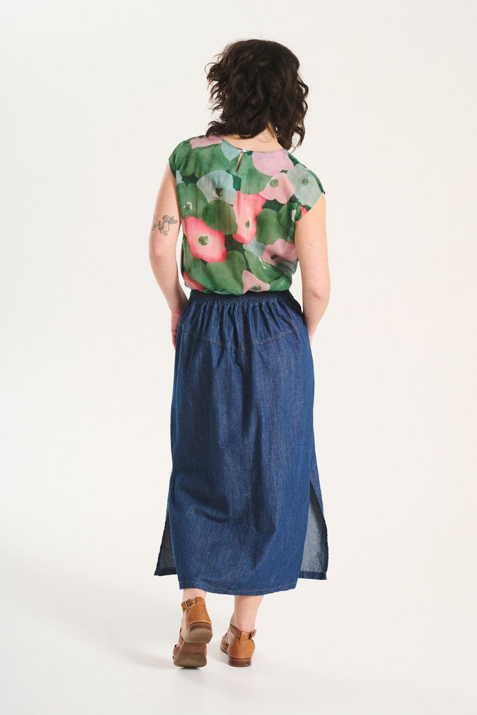 The Cardiff Skirt features a soft A-line silhouette with side splits for ease and movement. Deep front pockets add a touch of personality and practicality, while the elasticated back waistband ensures all-day comfort. Finishing at a flattering mid-calf length, this versatile skirt is a true wardrobe essential—perfect for effortless day-to-night styling.