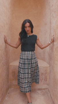 The Tangier Plaid Skirt combines timeless tailoring with a relaxed, modern ease. This pleated midi skirt features a gently structured silhouette with neat knife pleats falling from a wide, flat waistband, creating a flattering A-line shape that moves effortlessly while grazing mid-calf. Crafted from a lightweight yarn-dyed linen-cotton blend, it offers a softly washed hand-feel with subtle crispness.