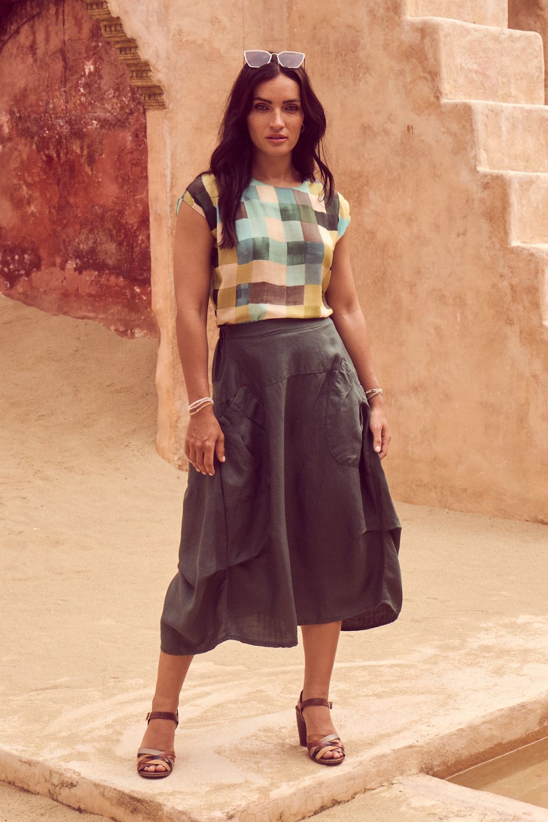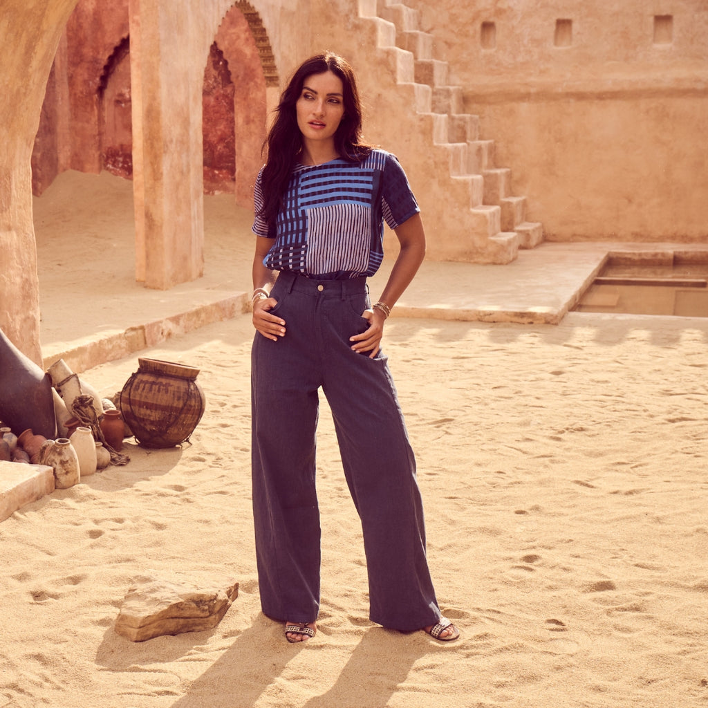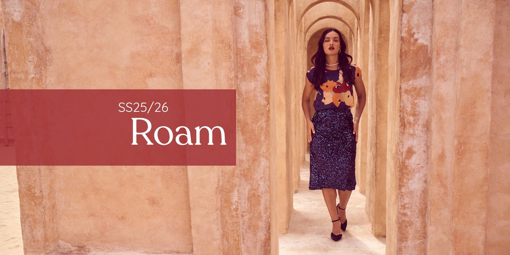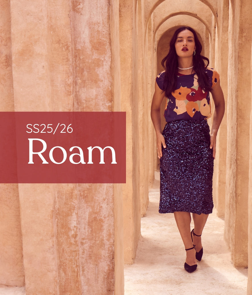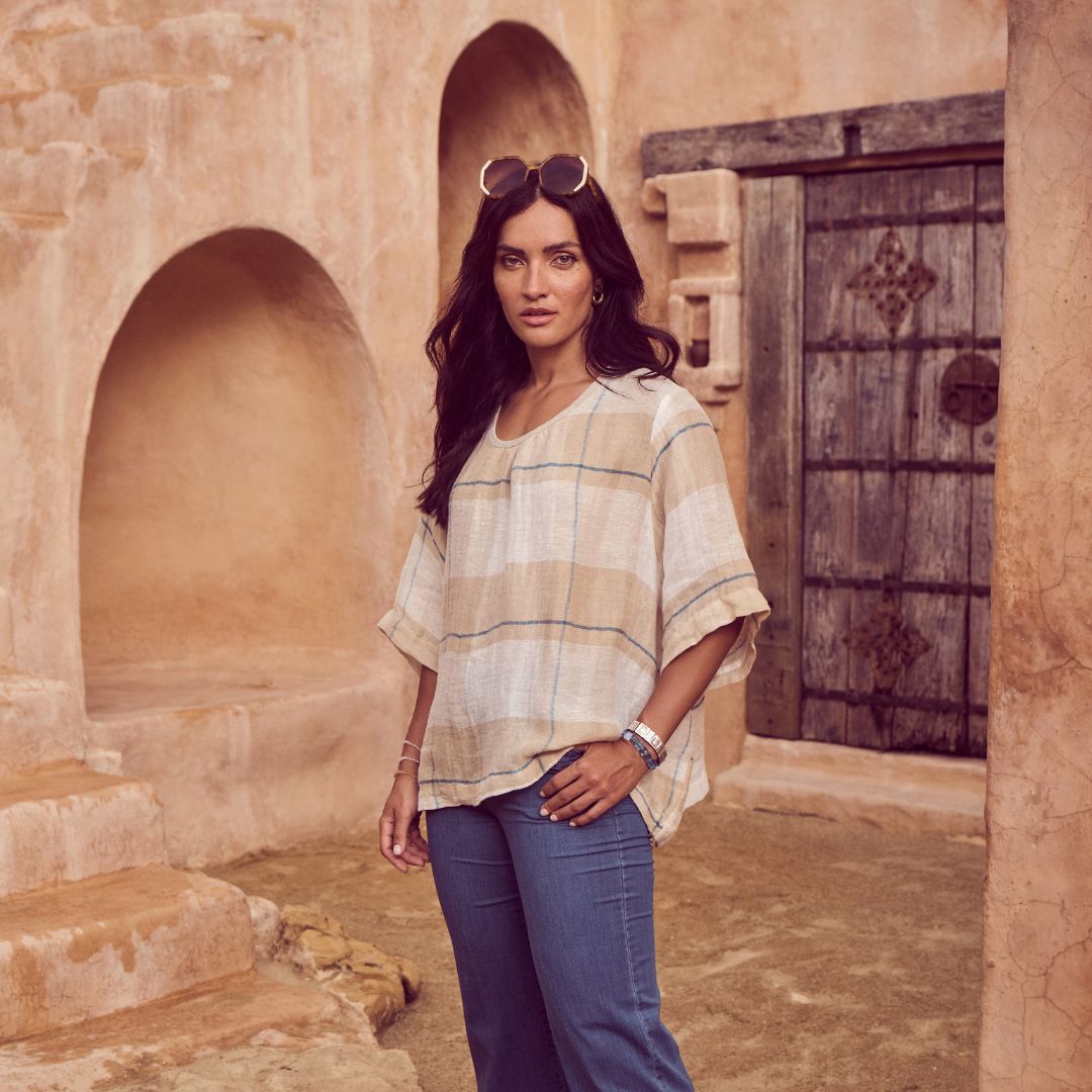 The palette draws on warm skies, coastal stone, and sun-bleached landscapes, while the textiles: breathable linens, crinkled cottons, and textured checks; are chosen for their natural drape and effortless feel. Our signature silhouettes return, including the Tee, Top, Camisa, Villa Dress, Pleat Skirt, and Shirt, joined by standout newcomers that embody Roam’s relaxed elegance.