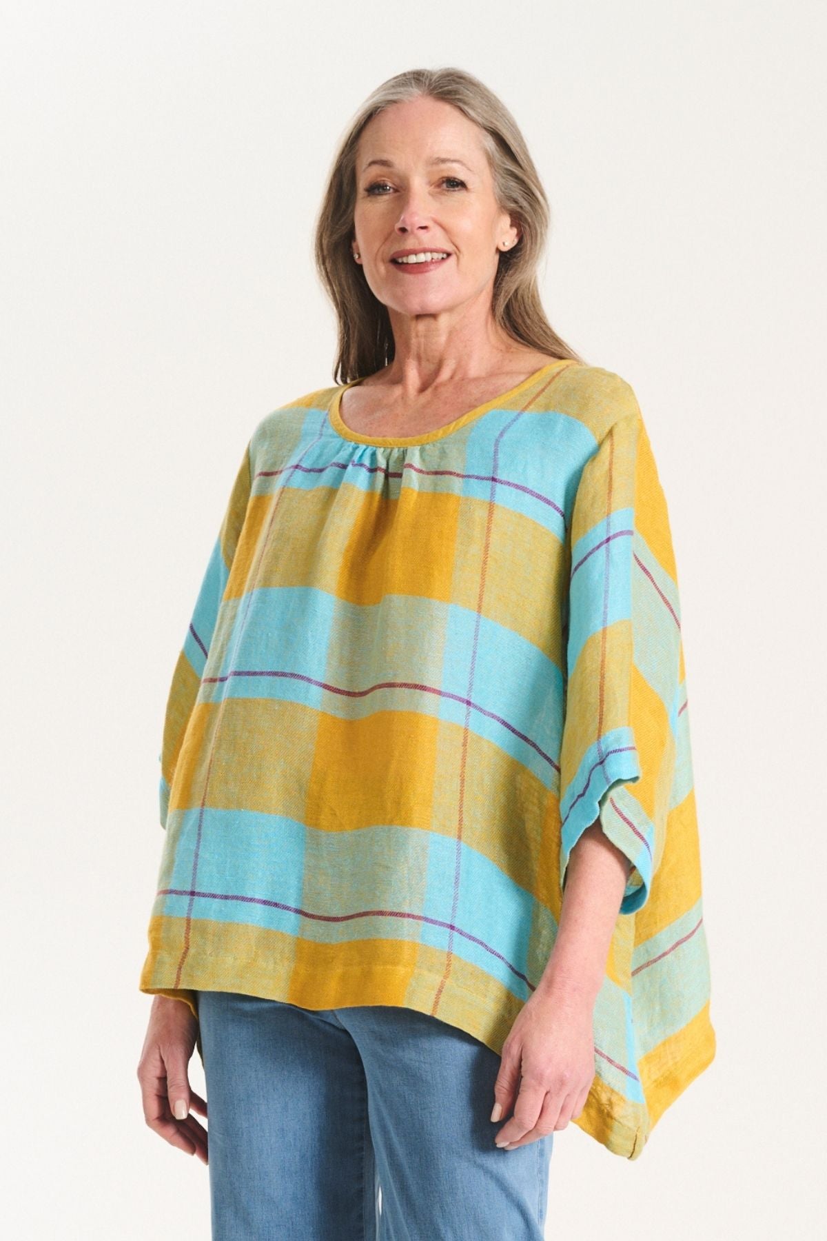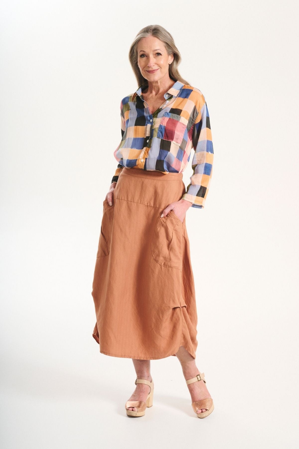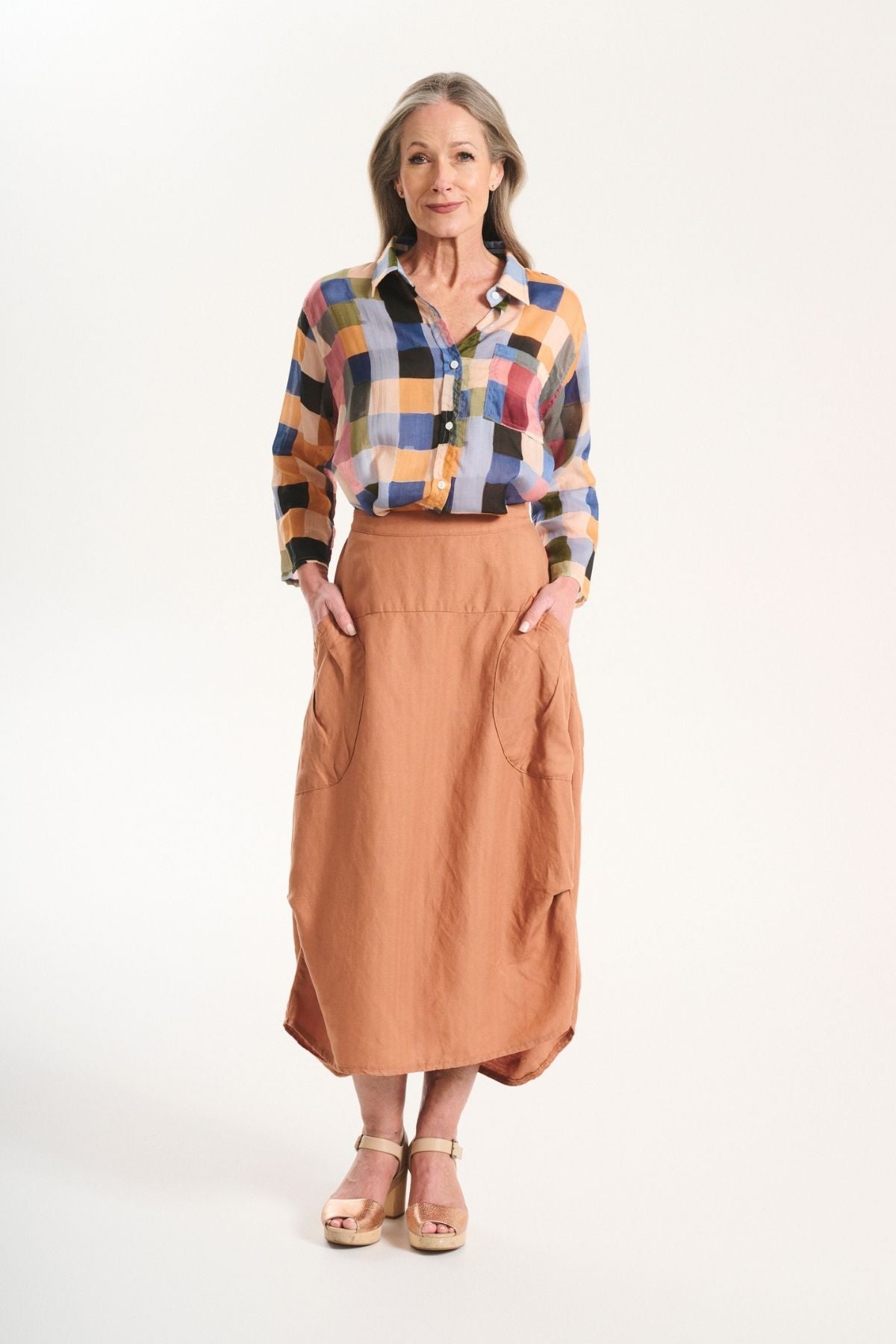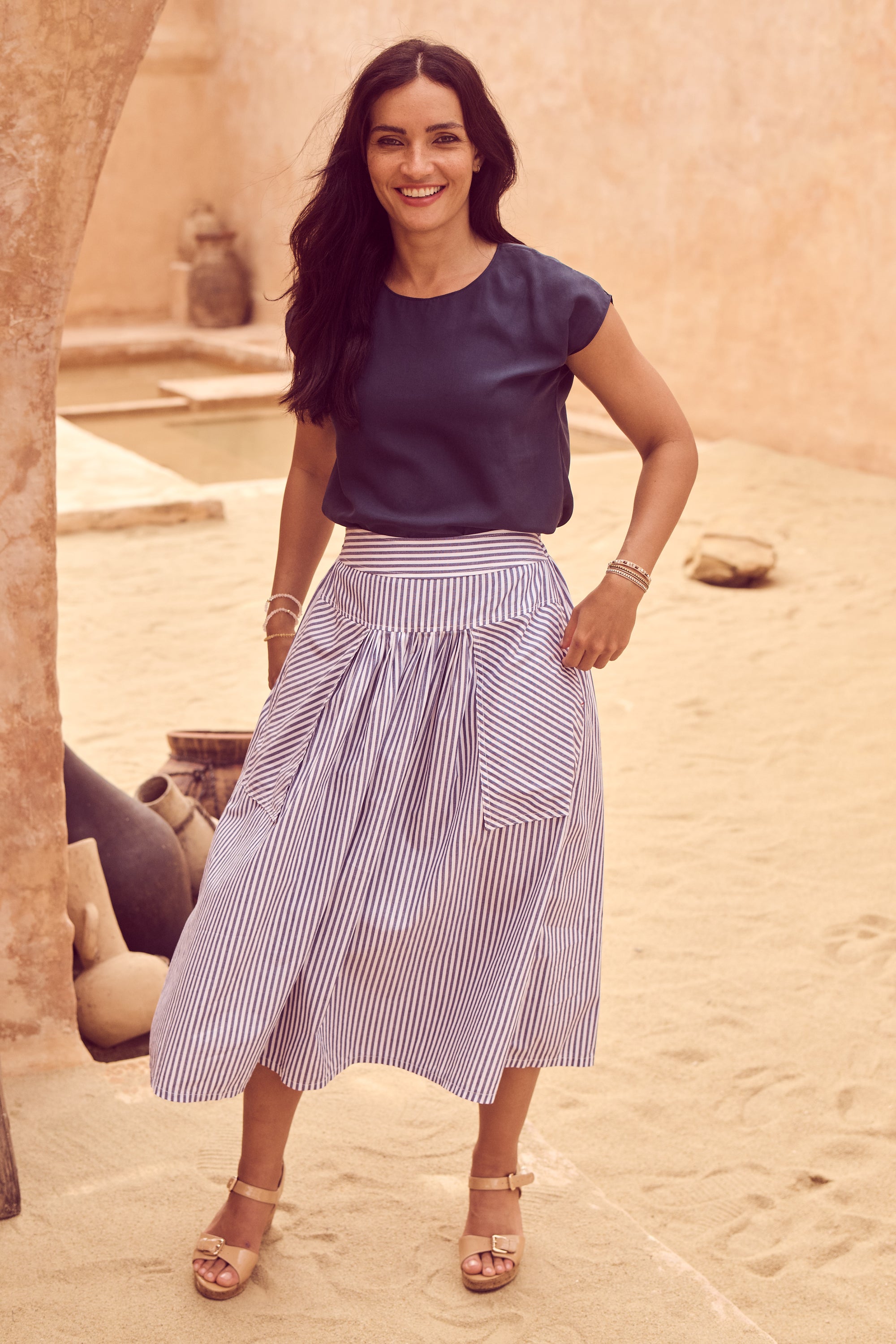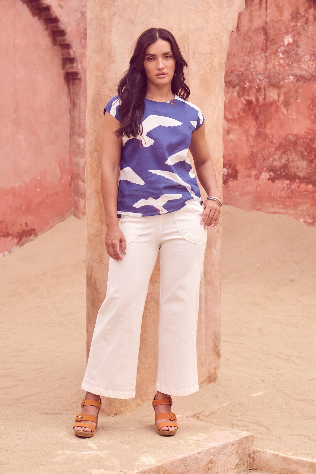 The palette draws on warm skies, coastal stone, and sun-bleached landscapes, while the textiles: breathable linens, crinkled cottons, and textured checks; are chosen for their natural drape and effortless feel. Our signature silhouettes return, including the Tee, Top, Camisa, Villa Dress, Pleat Skirt, and Shirt, joined by standout newcomers that embody Roam’s relaxed elegance.