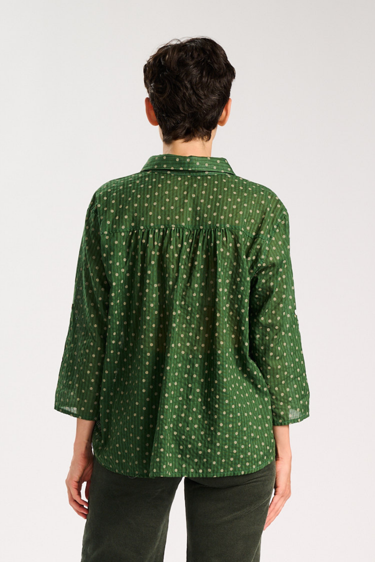 The combination of print and texture creates a relaxed, lived-in look that feels easy to wear and visually interesting up close. It’s a versatile design that balances charm and simplicity, working effortlessly across everyday silhouettes.