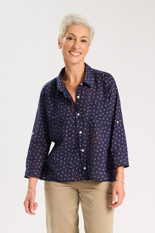 Celeste features a classic polka dot print set against a softly textured base fabric. The evenly spaced dots bring a timeless, playful feel, while the subtle crinkle in the cloth adds depth and movement, preventing the design from feeling flat or overly graphic.