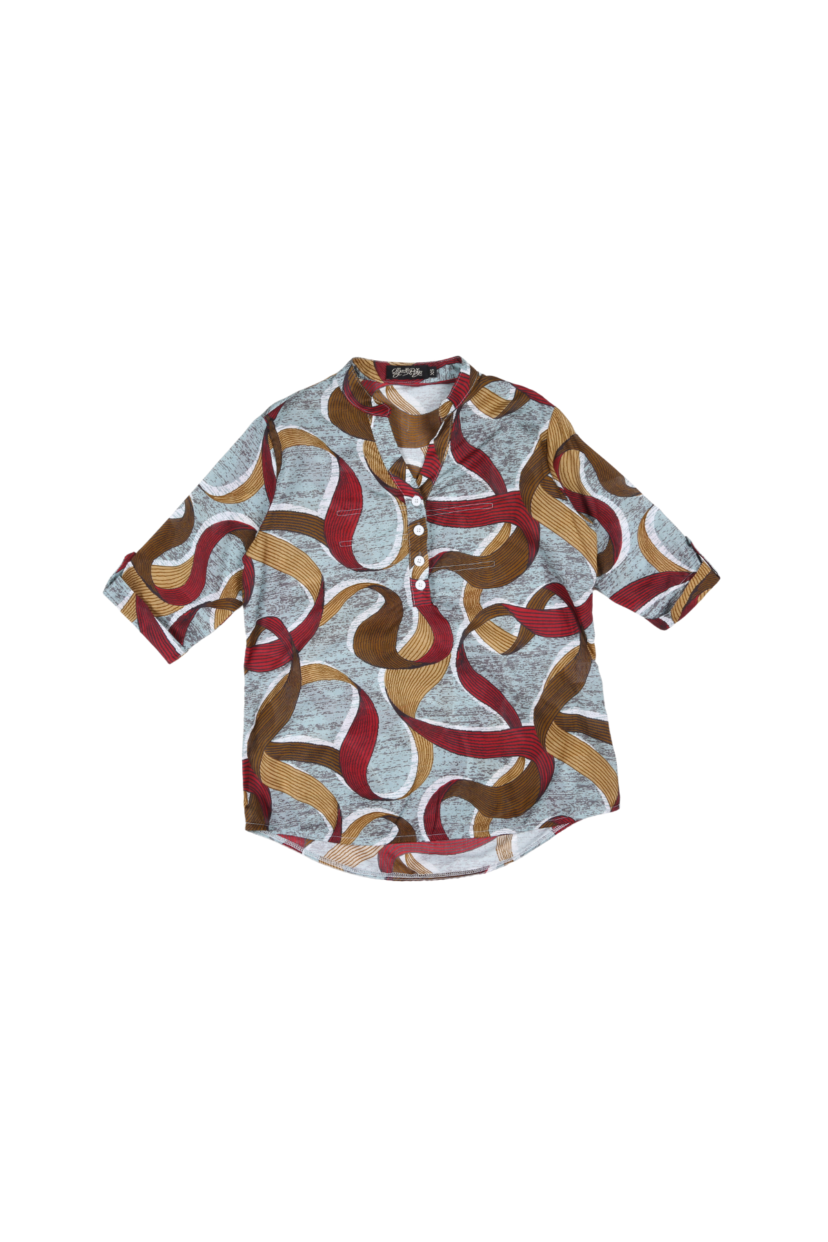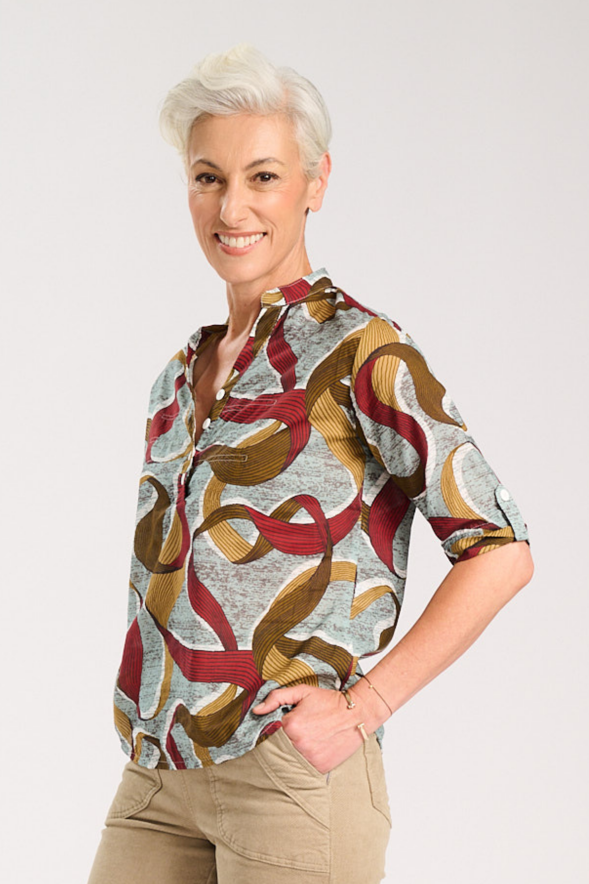 Featuring a neat band collar and a partial button front, Lucie sits comfortably between a shirt and a blouse. The three-quarter sleeves and gentle drape make it an easy option for warm days or light layering, with a polished finish that works dressed up or down.