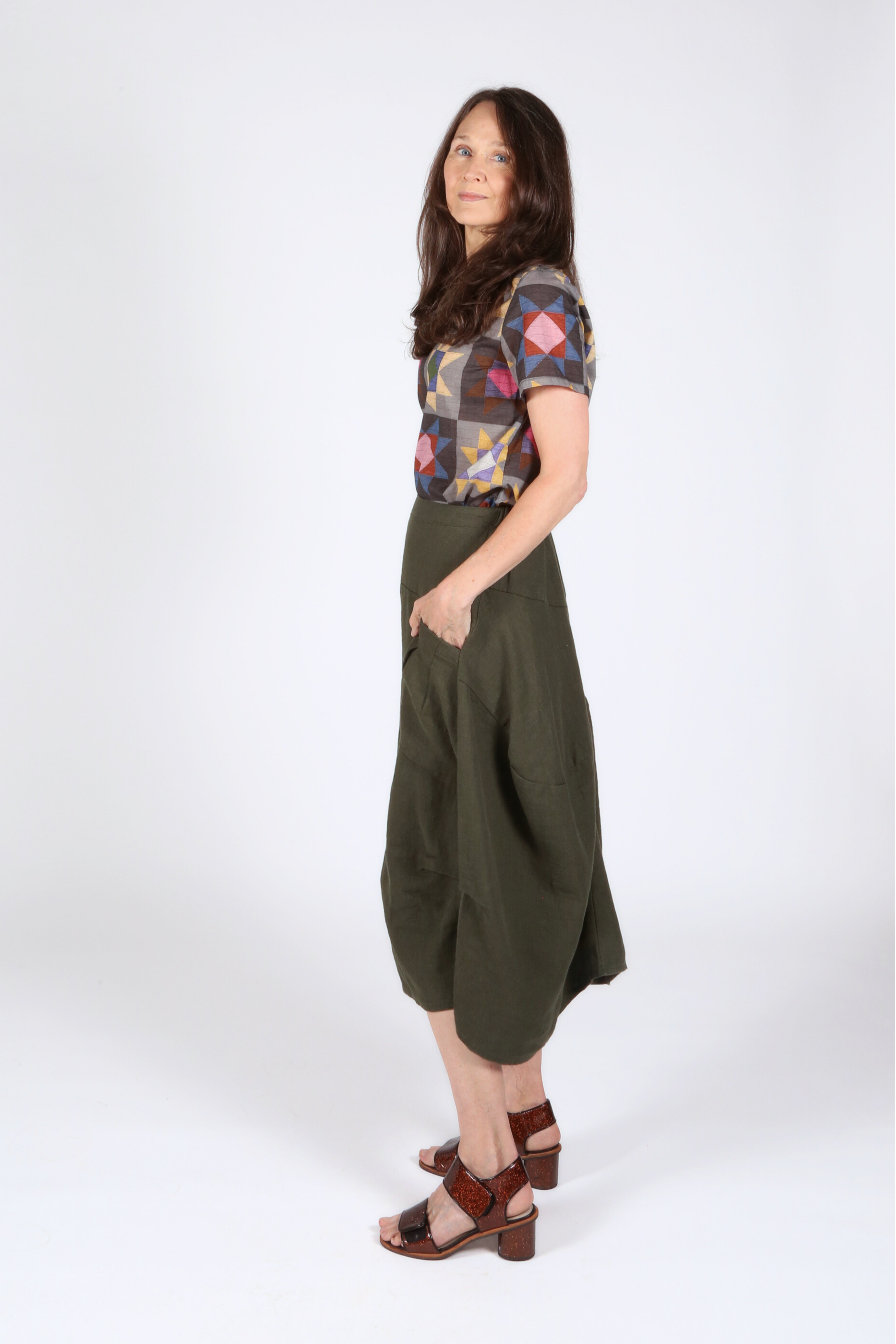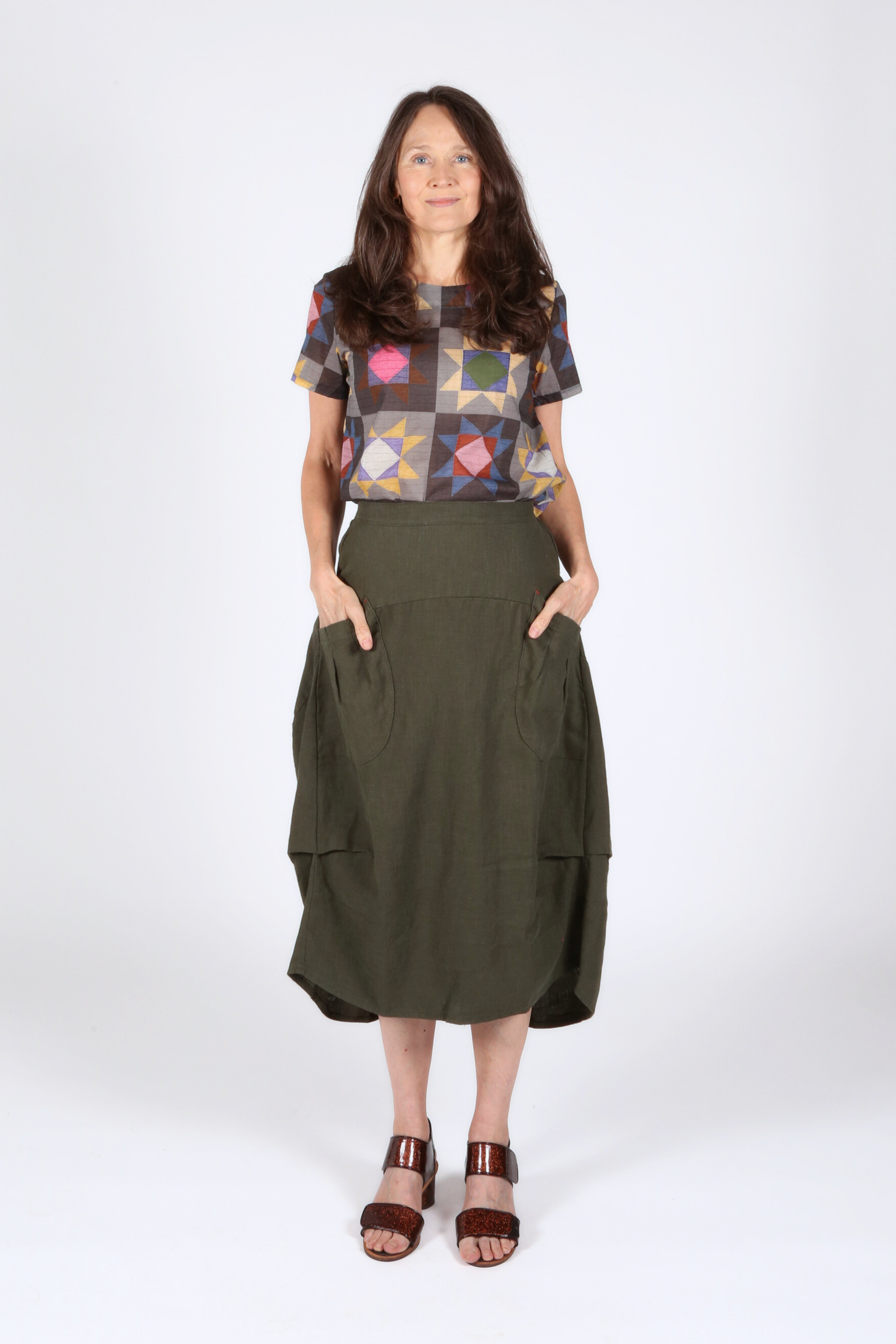 The Milwaukee Skirt is a comfortable, moderately relaxed fit. The elastic waistband and a-line shape mean that there is a good amount of room in the waist and hips.